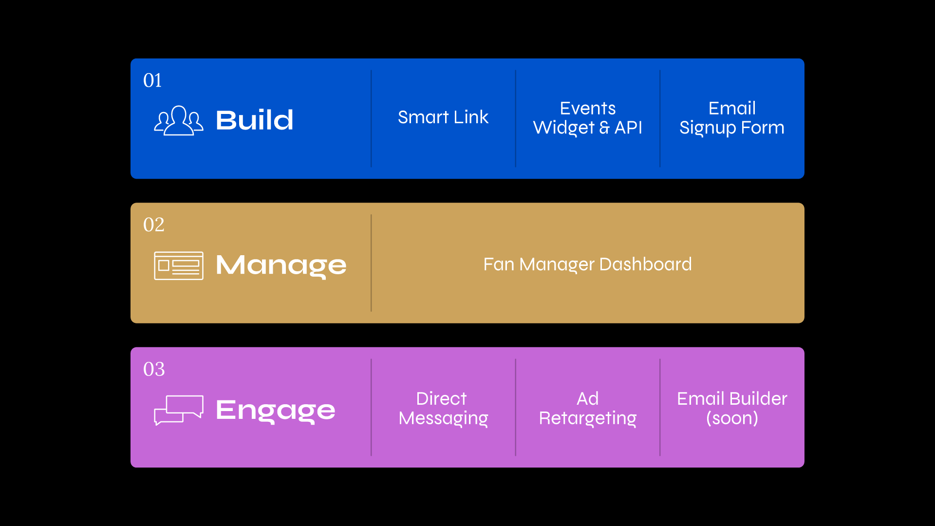 Now available to all artists, this free suite includes customizable tools like our Events Widget, Smart Link, and Email Signup Form, which let you simultaneously collect fan data, build your mailing list, grow your Bandsintown following, and promote your shows.