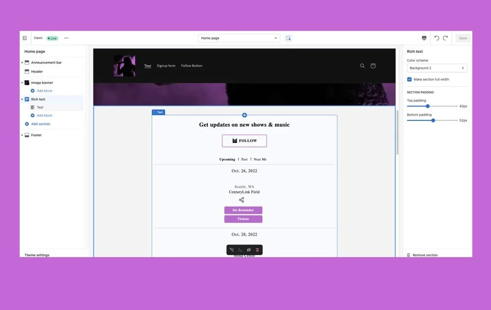 Select the page where you want to display your tour dates (or create a new one)