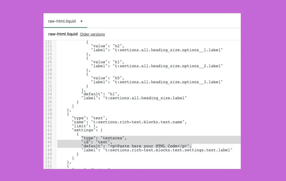 2. Open the section “raw-html.liquid” and replace the reference to “section-rich-text.css” for “section-raw-html.css” like the image below