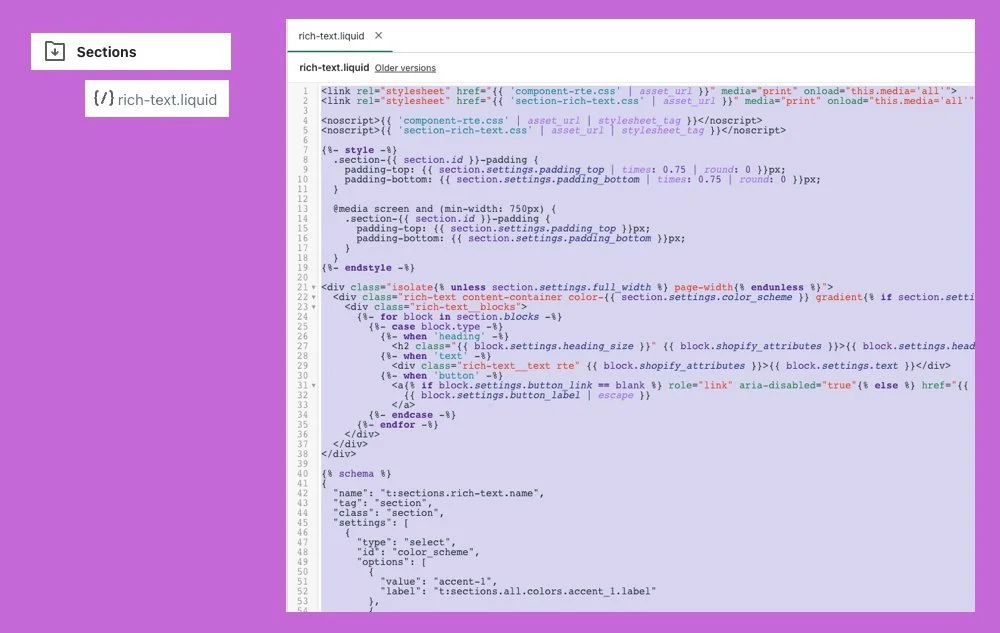 2. Go to Sections and Open the Section called “rich-text.liquid”, then copy the entire text.