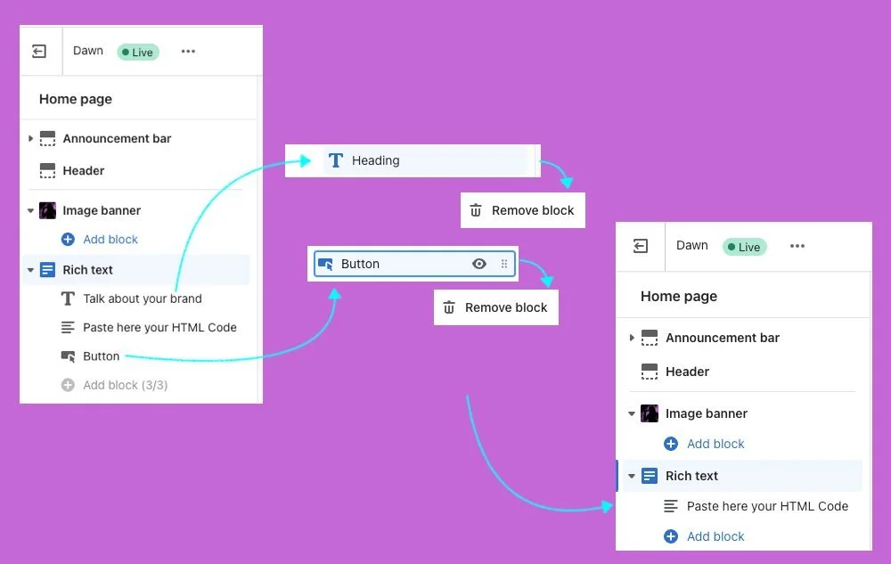 Remove the Heading and the Button, so at the end you will see only the Block “Paste Here Your HTML Code“