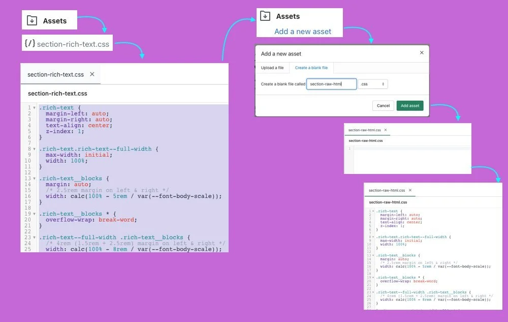 1. Go to Edit code and Search for the Asset “section-rich-text.css”, then copy the code of this css and create a new asset called “section-raw-html.css”, then paste the code.