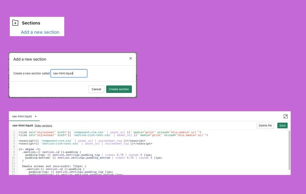 3. Got to Add a new section, call the new section : “raw-html.liquid”, then paste the code you copied on steep 2.